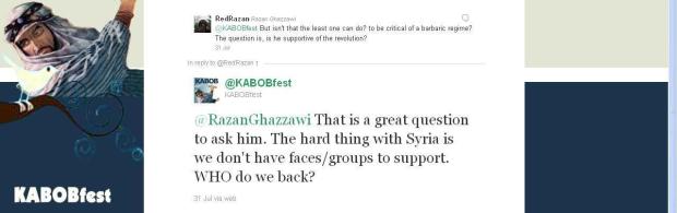 Also, it’s not enough to say you support the toppling of the regime, like the Angry Arab keeps regurgitating, while you make it your full time job to smear every personality in the opposition and to make fun of all eyewitnesses from Syria who come on Al Jazeera. As’ad Abukhalil can brag about his history of leftist struggle all he wants, as Razan rightly suggests, he’s still insisting on living in a past era and looking through the same old binoculars.