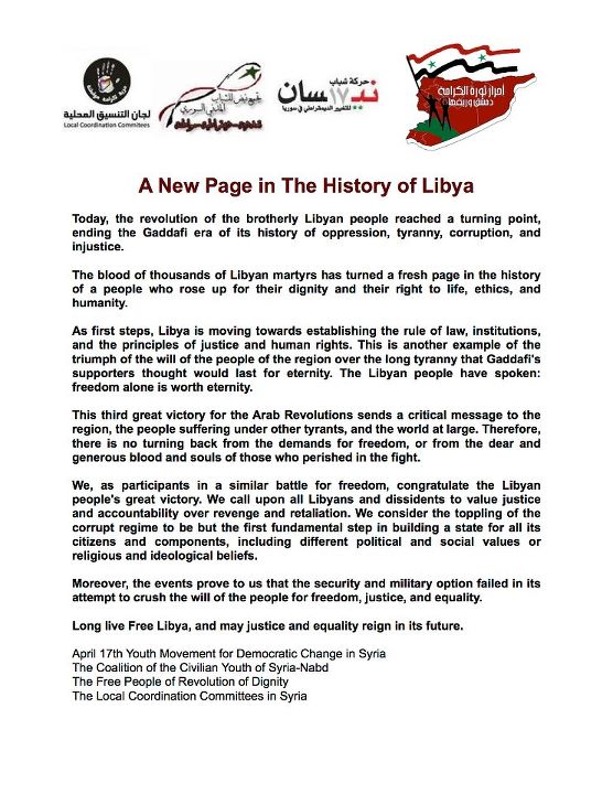 Below is a statement issued today by Local Coordination Committee and other Syrian revolutionary groups congratulating the revolutionaries in Libya on their victory: