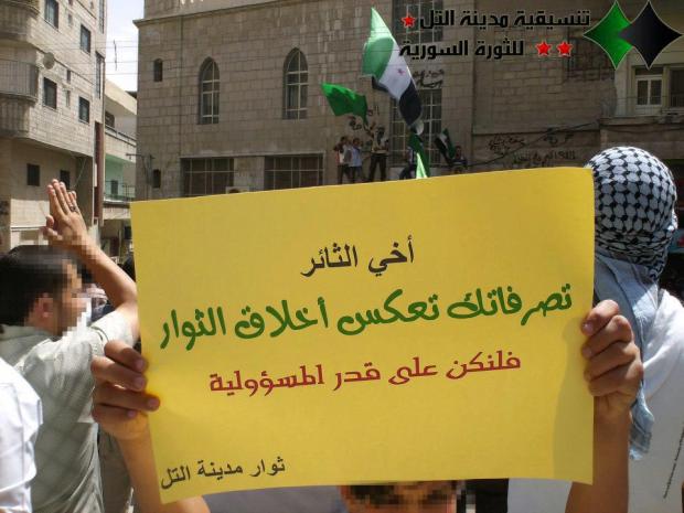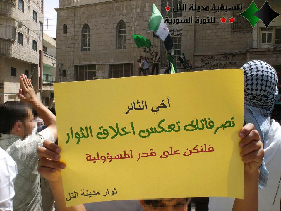 “Our city has been destroyed,” types Ashor, a relief activist and owner of a grocery store which has just opened now to secure food distribution for the besieged people who remain in the city. “In July last year,” he continues, “we distributed dates and water on regime forces[1], we organized a “Dignity Strike” in collaboration with shop keepers[2], we launched anti-sectarianism campaigns[3], we worked hard and we did an excellent job.” Ashor gives proudly examples of revolutionaries in Al-Tal, but is helpless about what the situation is turning into.