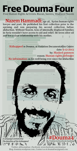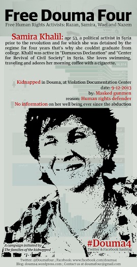 After almost six months since the kidnapping of Razan Zeitounah, Samira Khalil, Wael Hamadah and Nazem Hammadi by masked armed groups in Douma on 9th of December 2013. We, the families and friends of the kidnapped along with a group of independent activists, launch #Douma4 that’s aiming to put pressure on the kidnappers to release them and tell us about their safety and well-being.